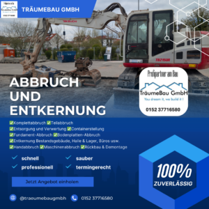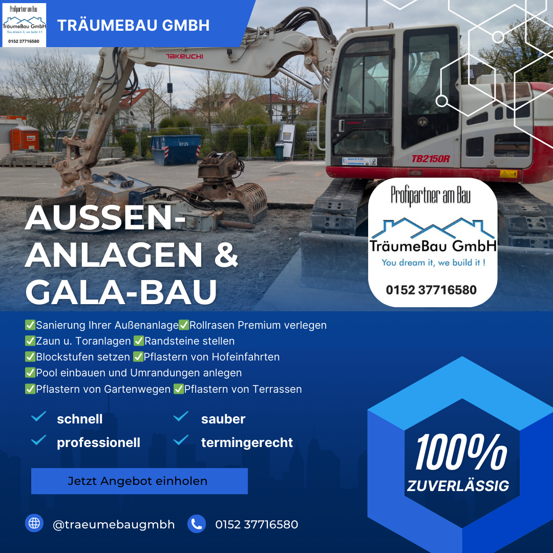 TräumeBau GmbH – Abbruch, Tiefbau & Außenanlagen im Rhein‑Pfalz‑Kreis. Die TräumeBau GmbH ist Ihr zuverlässiger Partner für Abbrucharbeiten, Tiefbau, Erdarbeiten, Pflasterbau und hochwertige Außenanlagen in Mutterstadt, Harthausen und der gesamten Region. Wir verbinden präzise Handwerksarbeit mit moderner Technik und sorgen für saubere, termingerechte Ergebnisse – vom kleinen Privatprojekt bis zur anspruchsvollen Baumaßnahme. Unsere Leistungen umfassen Abbruch & Entkernung, Baggerarbeiten, Fundament- und Erdarbeiten, Pflaster- und Hofgestaltung, Betonarbeiten sowie Kellersanierung. Als inhabergeführtes Unternehmen stehen wir für direkte Kommunikation, transparente Abläufe und fachgerechte Ausführung. Kontaktieren Sie uns für eine unverbindliche Beratung oder ein individuelles Angebot.